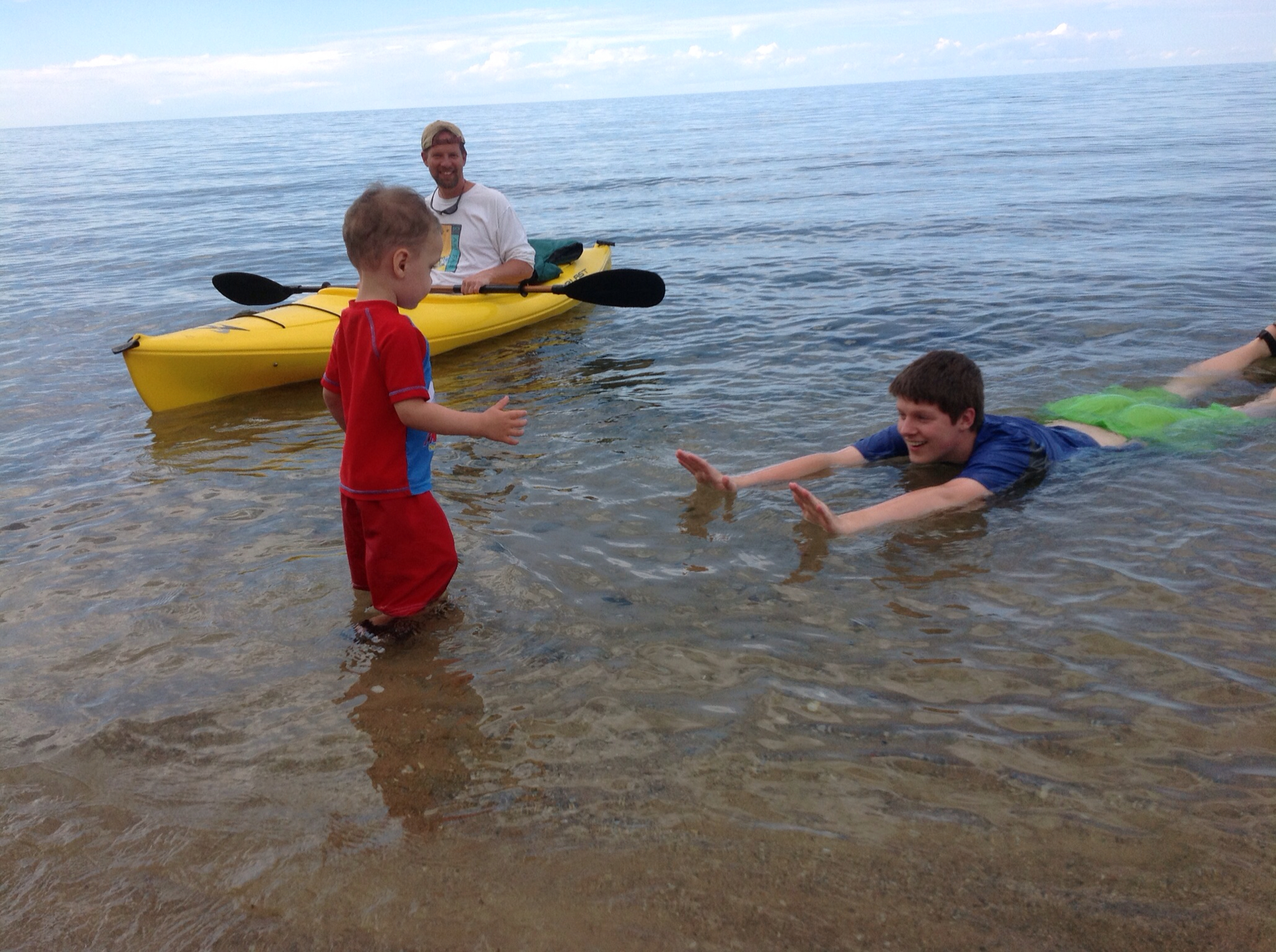 Although Japer has been on a ferry, I think today he had his first true boat ride. When you're in a rowboat you can actually feel the waves and you have to wear a lifejacket, that's real boating. He did very well. Jack was trying to get him to sit on his lap, but Jasper insisted on being in the center seat. My dad took a few laps with the motor on, Jasper smiled a little bit and waved at me once. Once on shore, he tried to steer Jack back to the boat. Later in the day, he spotted the rowboat and said, "Mine."